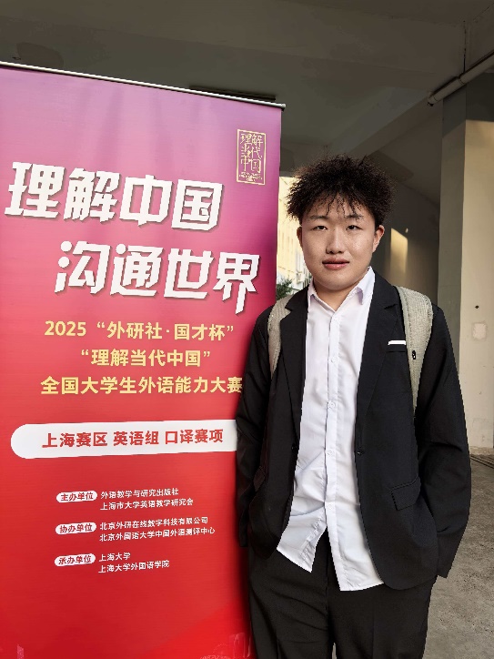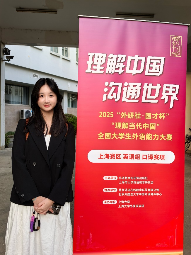 参加上海市外研社国才杯口译市赛,对我来说是一次真正意义上的历练。从备赛到上场,每一步都让我重新认识“语言”的力量。无数次的听译练习与模拟实战,让我在紧张中学会沉稳,在压力下找到节奏。站在赛场上那一刻,我感受到的不只是竞技的刺激,更是一种责任与荣光。特别感谢魏老师和张老师在备赛期间的悉心指导,也感谢学姐的耐心陪练与鼓励——每一次纠正与建议都让我受益匪浅。这段经历让我更加坚定要继续深耕语言与沟通的道路,用口译的方式去理解世界、连接世界。