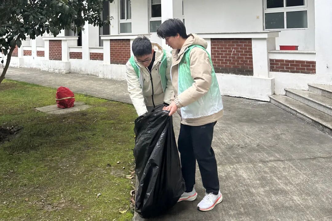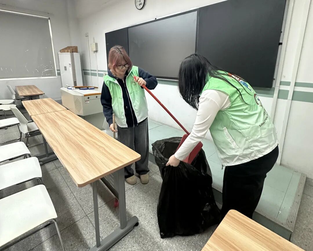 志愿者们穿梭于校园公共区域和教学楼内,弯腰捡拾散落的纸屑、塑料瓶等垃圾,用脚步丈量校园,用双手守护环境的洁净。