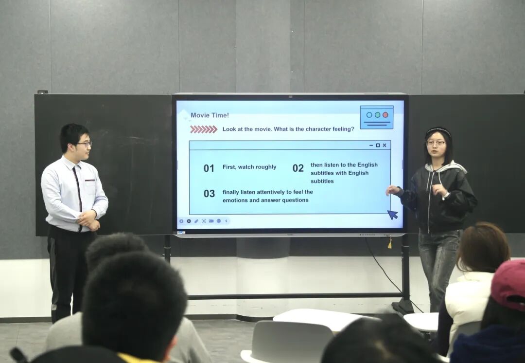 分享时刻活动一开始,大屏幕上闪现出一个个鲜活的情绪表情:沮丧的dejected、悲痛的grievous、震惊的shocked、愤怒的anger……现场瞬间被轻松温暖的氛围包裹。“Emotions are the colors of our life. Let's name them in English, and understand them better.“这些情绪是我们生命的色彩,让我们用英语为它们命名,更读懂自己的内心”,主持人用这句话打开了大家的话匣子。从基础情绪的快速认读,到深层情绪的深度解析,同学们跟着引导,系统梳理了apprehensive(忧虑不安的)、relieved(如释重负的)、frustrated(沮丧挫败的)等高频情绪词汇的音标、用法与适用场景,为后续的交流分享打下了扎实的语言基础。